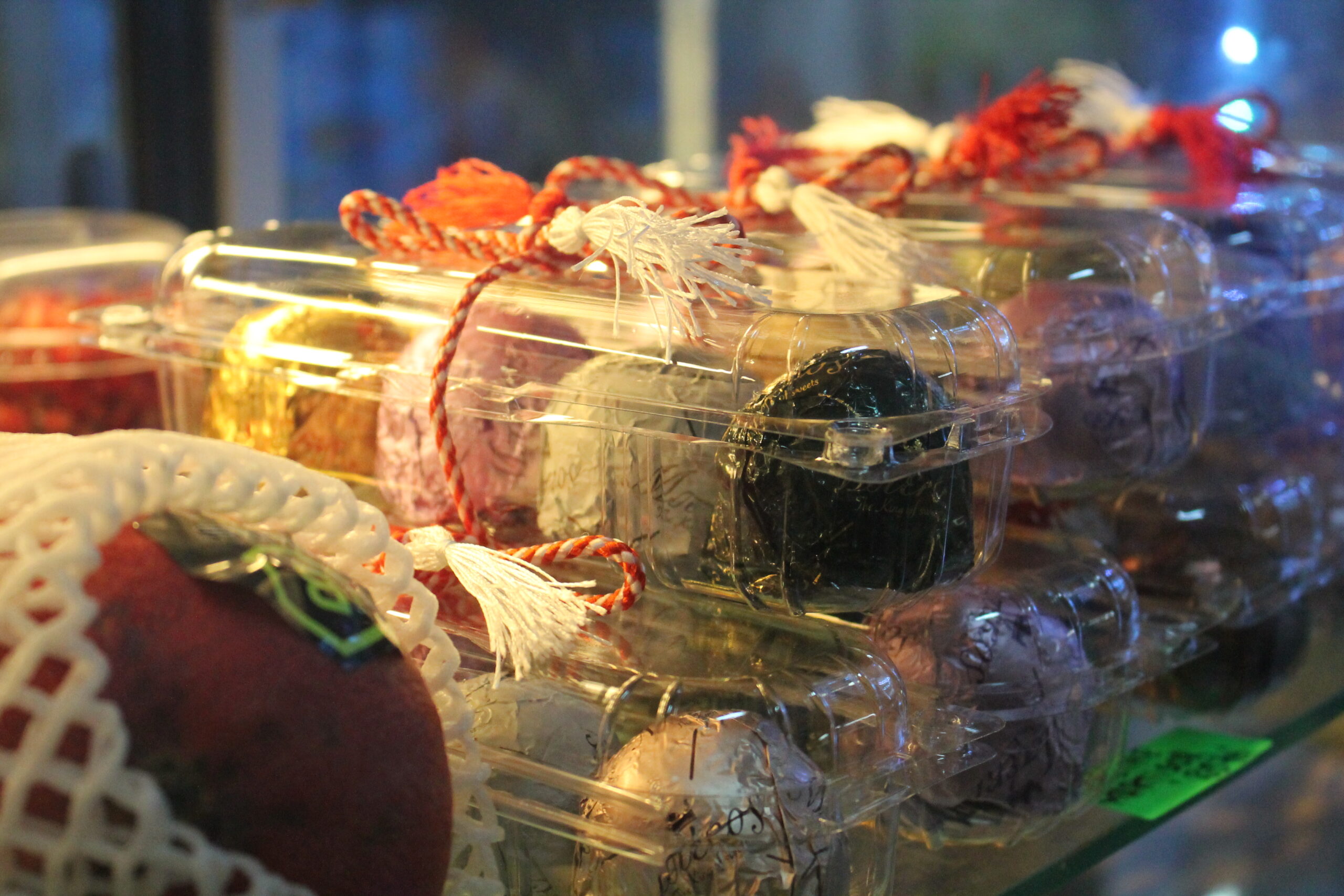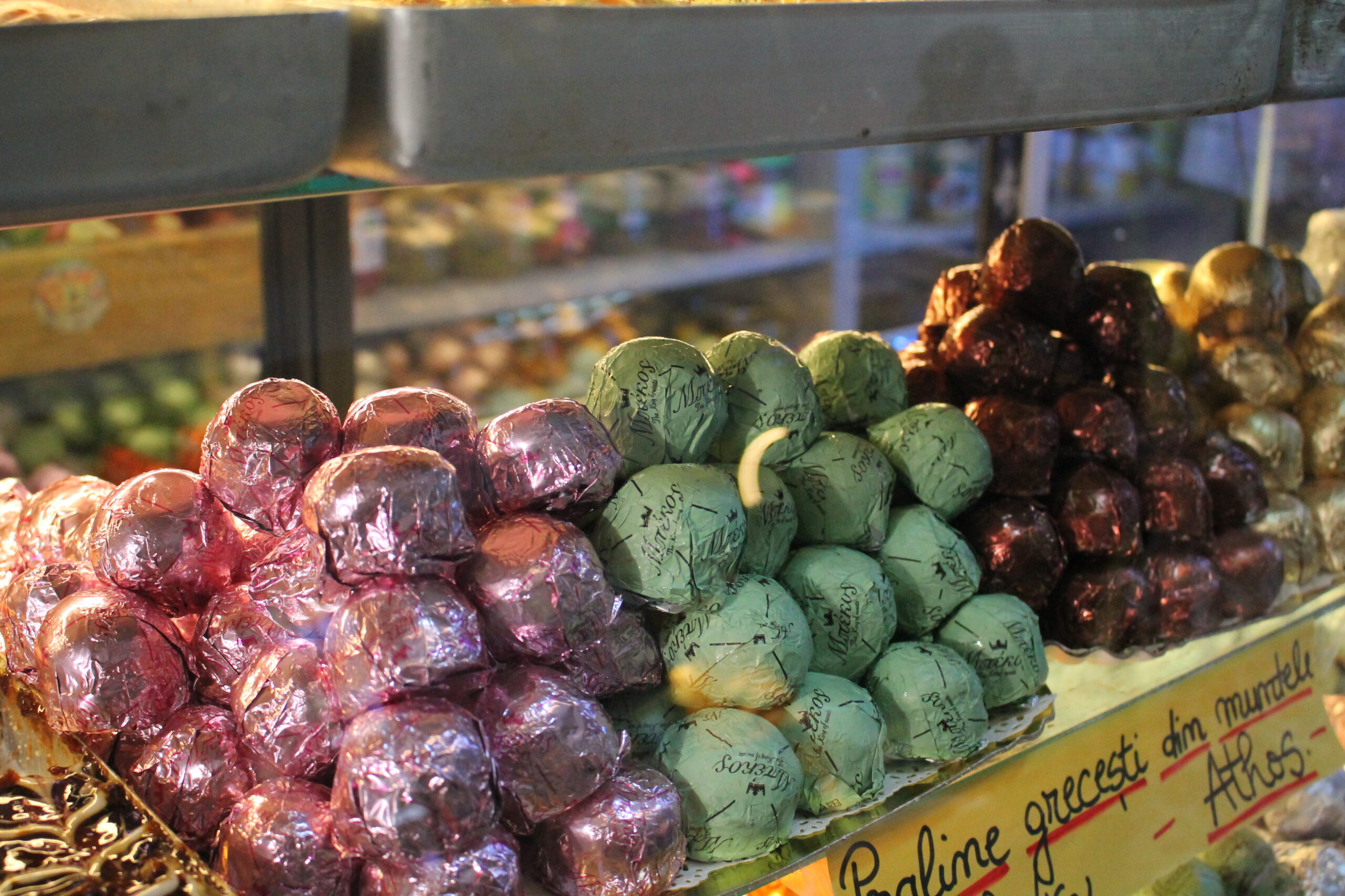 În această perioadă, în lăzile frigorifice puteți găsi 28 de sortimente de praline de la Muntele Athos, cu cremă de banane, lămâie, portocală, căpșuni, cireșe maraschino, alune de pădure, fistic, unt, lapte, caramel, etc, care îți vor încânta din plin pupilele culinare.