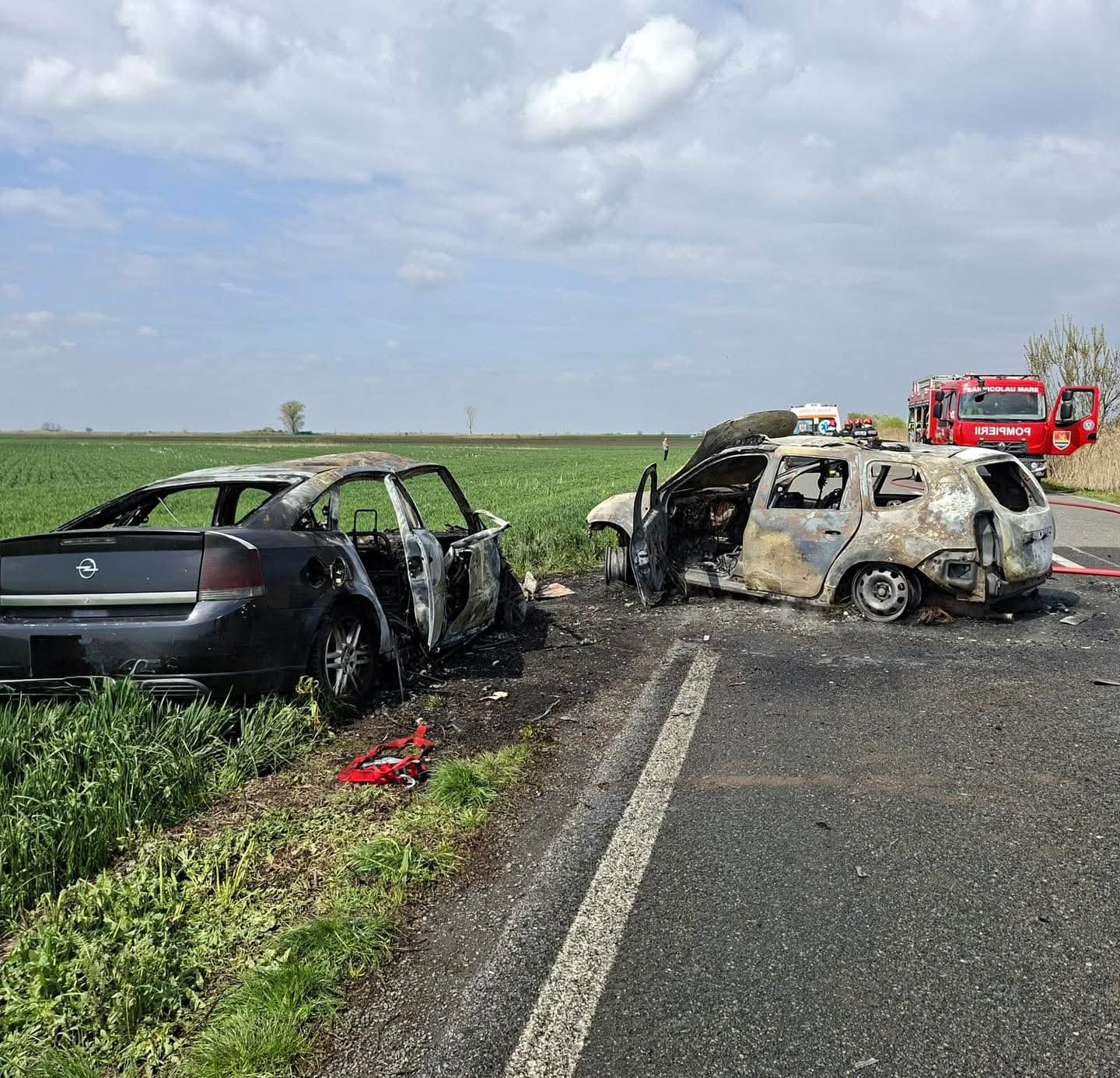 Un accident cumplit s-a produs în Sâmbăta Paștelui pe DN 59C, între localitățile Comloșu Mare și Teremia Mare, între două autoturisme. În urma impactului teribil, ambele mașini au luat foc.