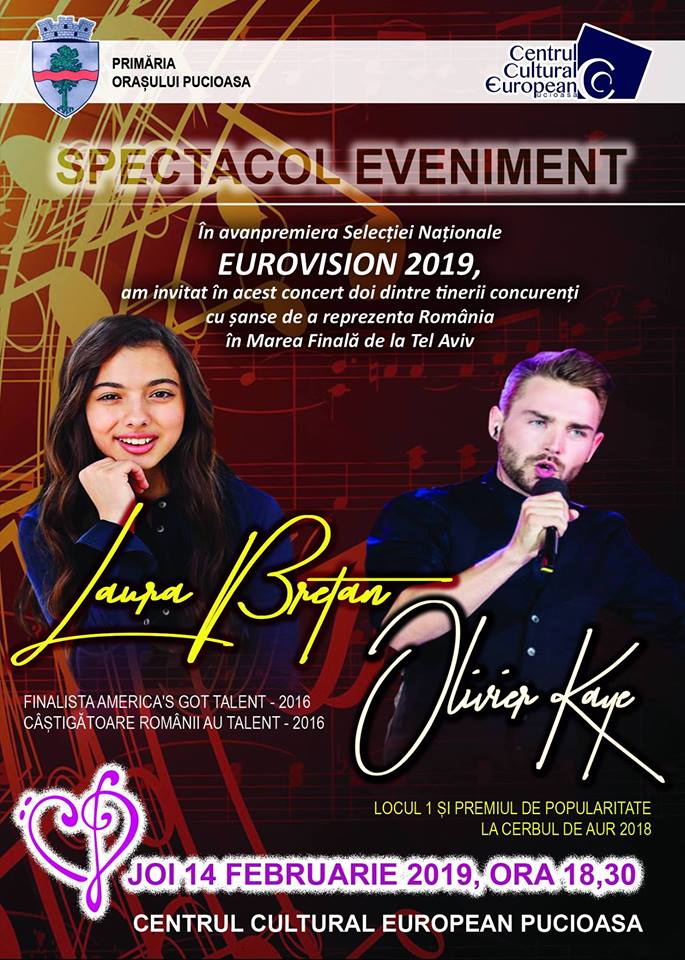 Concert eveniment la Pucioasa! Joi, 14 februarie, de Ziua Îndrăgostiților, pe scena Centrului Cultural European, în avanpremiera selecției naționale Eurovision 2019, vor urca doi dintre concurenții care au șanse mari de a reprezenta România anul acesta la Tel Aviv.