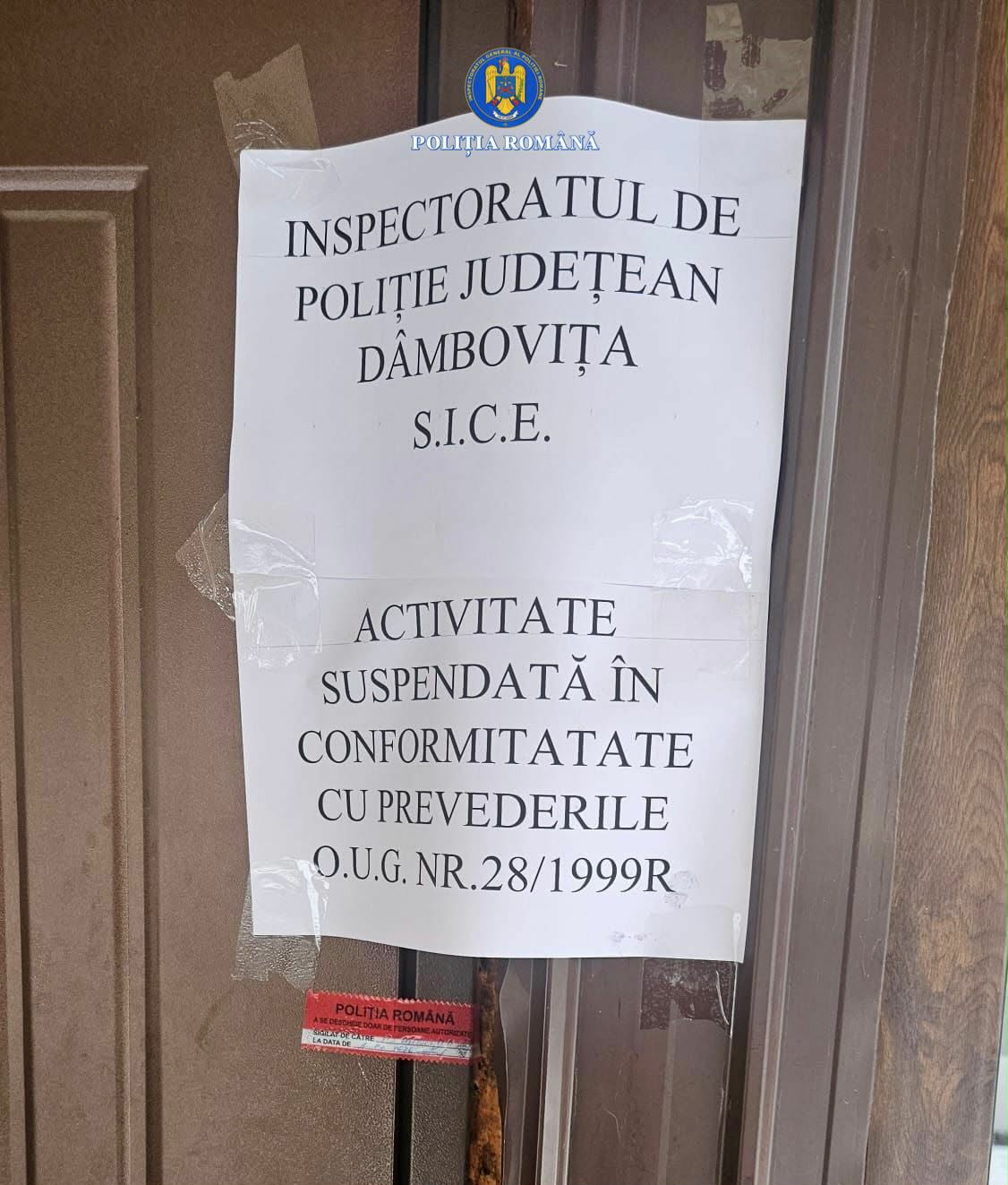 Mai mult, polițiștii Serviciului de Investigare a Criminalității Economice au aplicat 5 sancțiuni contravenționale, în valoare de 26.000 de lei, pentru nerespectarea prevederilor OUG nr. 28/1999 privind obligația operatorilor economici de a utiliza aparate de marcat electronice fiscale. Iar față de o societate comercială din municipiul Târgoviște, s-a dispus suspendarea activității, pentru neîndeplinirea obligației de a se dota cu aparate de marcat electronice fiscale, achiziționate numai de la distribuitori autorizați sau unități acreditate pentru comercializare.
