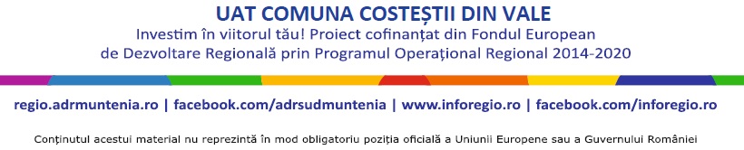 Date de contact beneficiar: UAT Comuna Costeștii din Vale, Localitatea Costeștii din Vale, str. Crinului, nr. 448, jud. Dâmbovița, persoana de contact – Manager proiect Matei Toma, telefon: 0245 717 025, fax: 0245 717 212, e-mail d.primariacostestivale@yahoo.com.