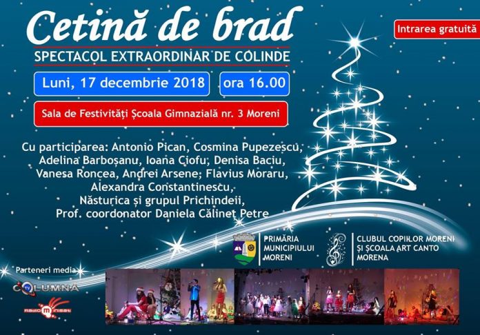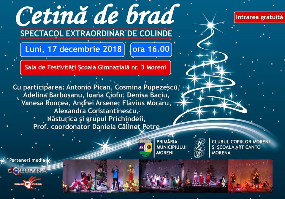 Spectacolul tradiţional de colinde ”Cetină de brad” va deschide în municipiul Moreni seria de evenimente dedicate sărbătorilor de iarnă. Acesta se va desfăşura pe 17 decembrie, ora 16.00, în Sala de festivităţi a Şcolii Gimnaziale nr. 3 din localitate.