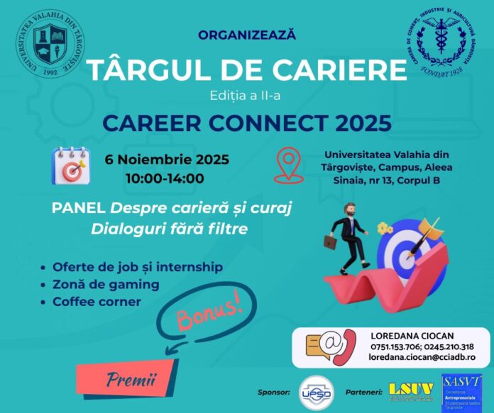Organizat de Camera de Comerț Dâmbovița în parteneriat cu Universitatea „Valahia” din Târgoviște, evenimentul oferă șansa celor care doresc să pornească o cariera de a interacționa direct cu profesioniști, companii și instituții care recrutează sau oferă programe de internship, training ori orientare în carieră.