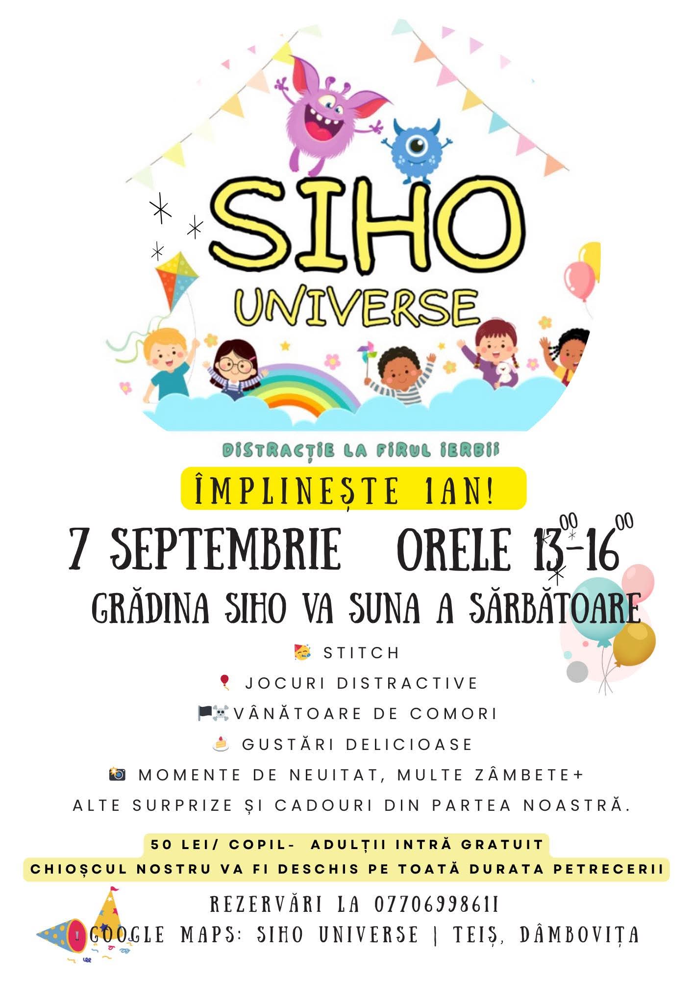 Așadar, mâine, 7 septembrie, între orele 13.00 -16.00, cu o zi înainte de startul noului an școlar, gradina magică SIHO Universe îi așteptă atât pe cei mici, cât și pe cei mari, cu o petrecere de poveste, cu multă joacă, muzică, clătite, surprize și multă voie bună.